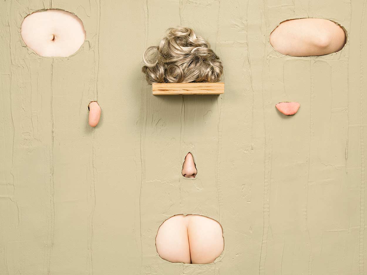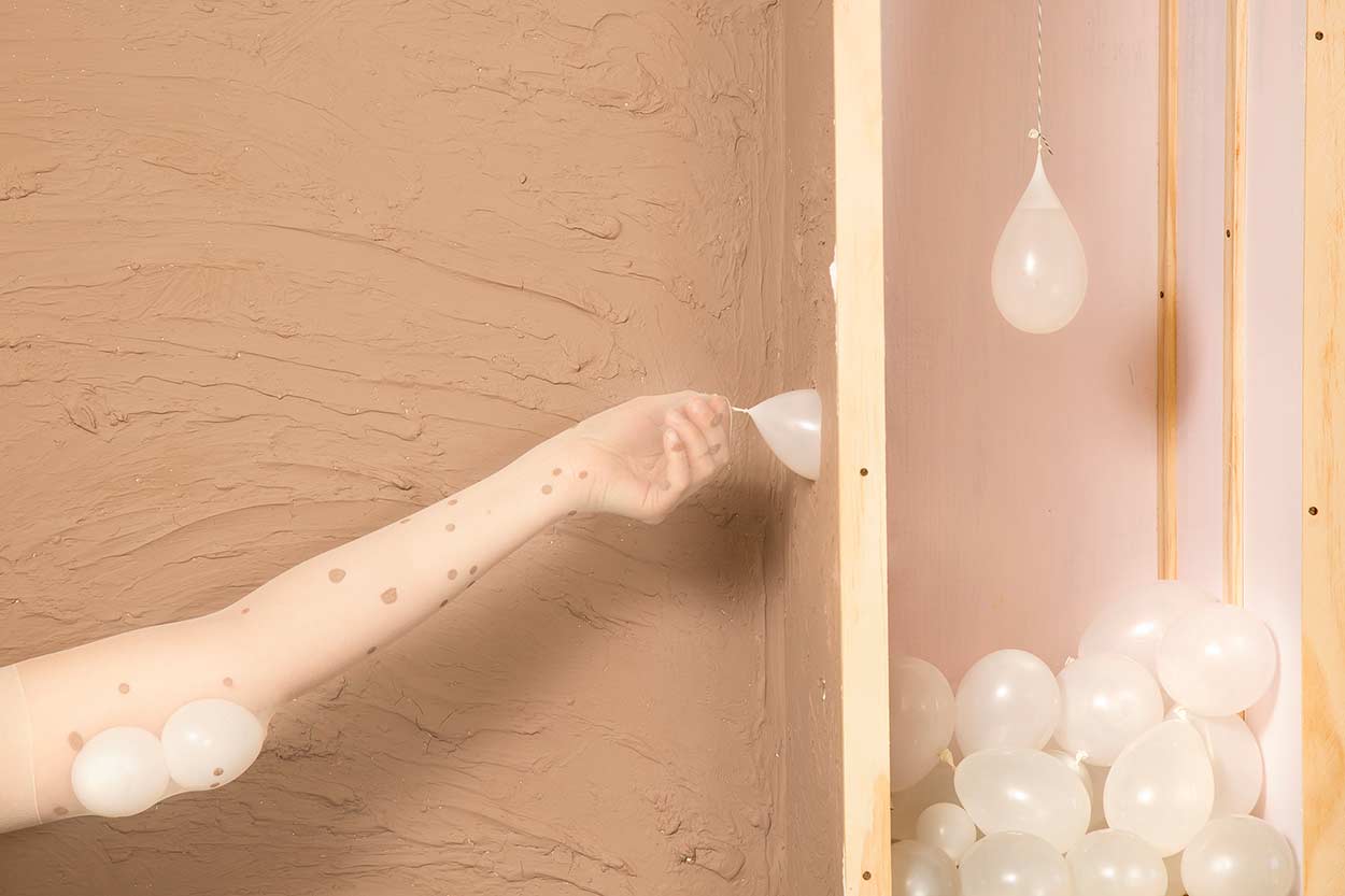 The spaces appear to be in a state of construction and change, just as the body itself is being reformed and re-identified. The images address the surreal nature of the body at large, constructed appearances, ideal gender performance, and how our physicality can communicate with others. While the work humorously points at the desperation of how women’s bodies are managed and adjusted, it also imagines how multiple female bodies can work together to build each other up.